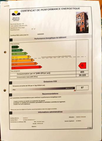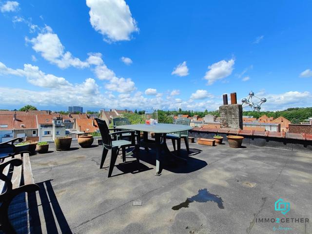 It is composed as follows: The front door opens onto the living/dining room (3 adjoining rooms), as well as the fully-equipped open-plan kitchen, 1 guest WC, 1 bathroom (bath, double washbasin), 1 large bedroom and an adjoining office/dressing room. On the upper floor (4th), 2 bedrooms, including 1 with access to a large terrace overlooking the beautiful ATOMIUM. Charges:70€/month (building ass, shared electricity, prov eau + reserve fund). VAILLANT individual gas boiler (condensation). PEB: G. Electricity compliant with RGIE. RU: in progress... More information? Contact us on 02/430.24.87 or mb@immo2gether.be