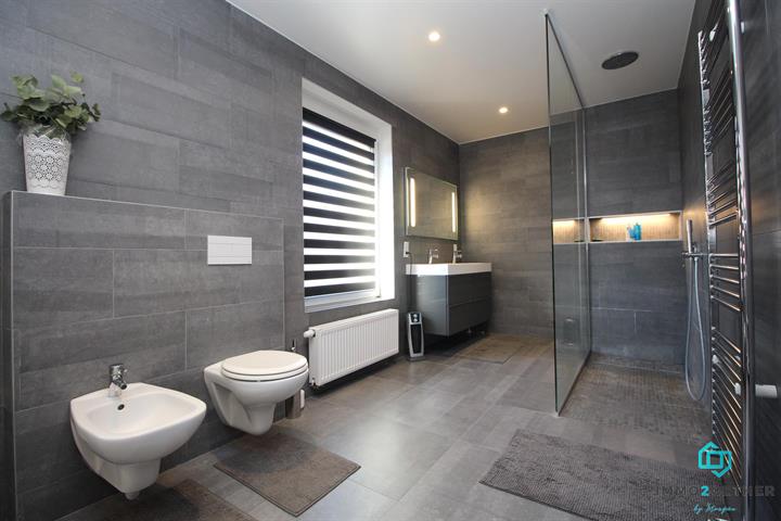 A l'étage, 1 grande chambre avec DRESSING et une grande salle-de-bain avec douche à l'italienne, double lavabo, bidet et sèche-serviette chromé. Au 2ième étage, 2 belles chambres dont 1 mansardée ainsi qu'un bureau. Il y a également un accès vers les combles).