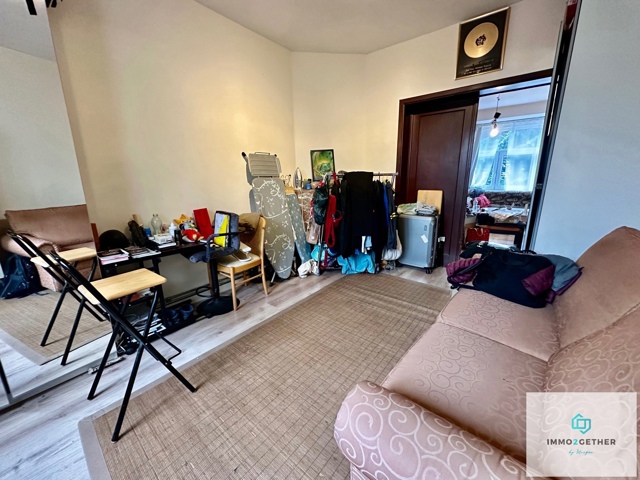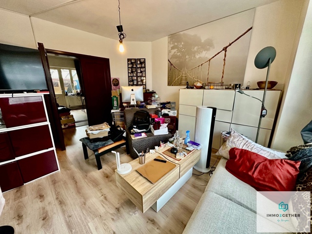 Au 1er étage, un bel appartement de +/- 70 m², comprenant un lumineux séjour, une cuisine ouverte semi équipée, une chambre (+/- 13m2), ainsi qu'une salle de douche et WC séparé. Châssis double vitrage en PVC côté rue. PEB: F. Chaudière commune (avec le 3ième appartement) au gaz. Electricite conforme au RGIE.